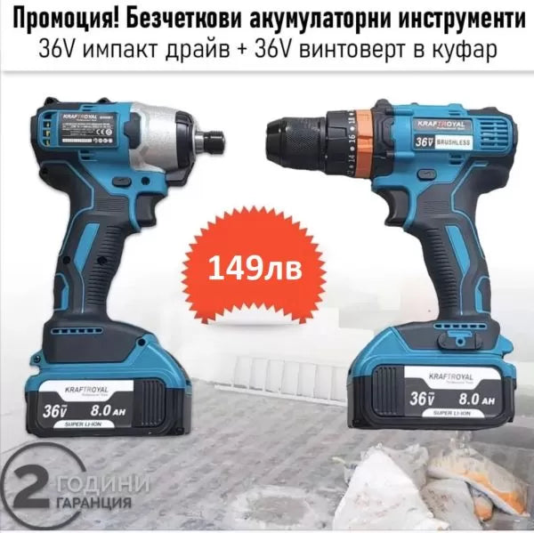 Акумулаторни безчеткови импакт и винтоверт 36V 8AH в куфар KRAFTROYAL