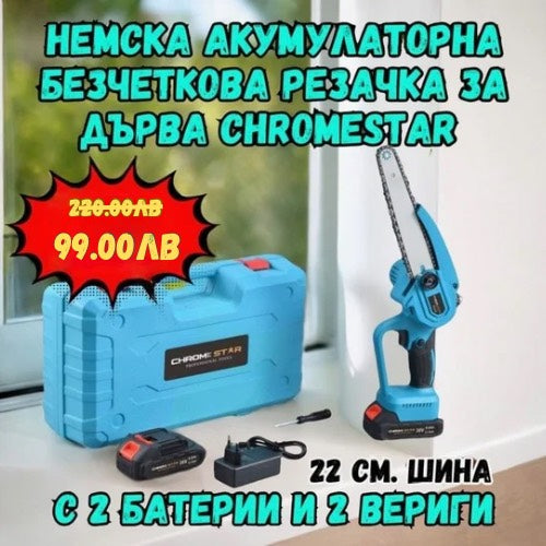 Немска Акумулаторна Безчеткова резачка за дърва ChromeStar с две батерии + две вериги