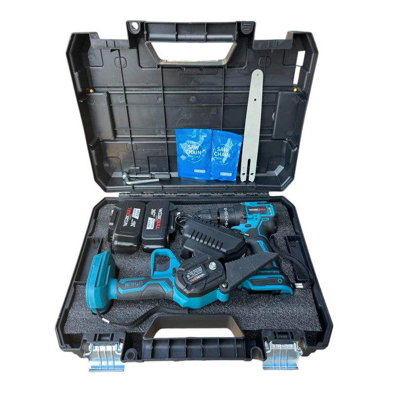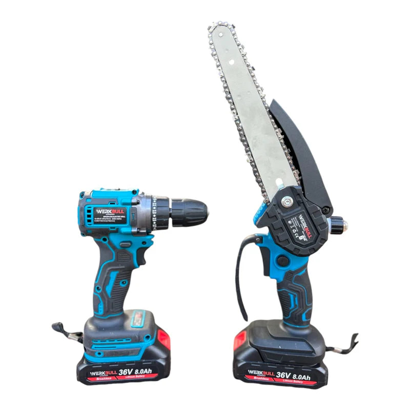 2в1 Комплект Ударен Винтоверт и Резачка WerkBull с автоматично омасляване 22см шина + две батерии 36v 8ah